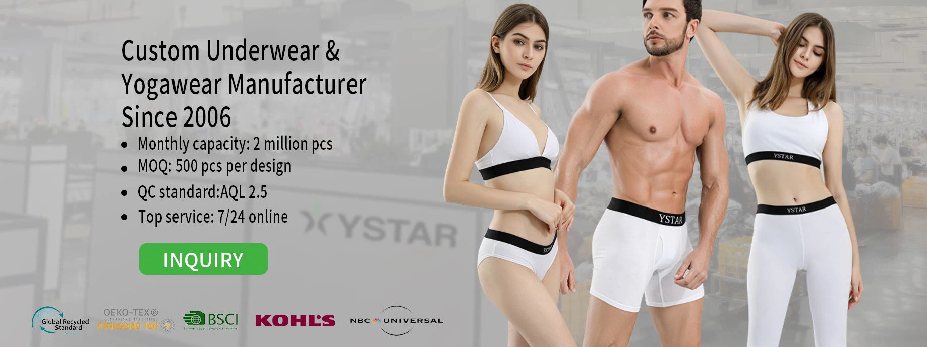 YSTAR Underwear - это предприятие, специализирующееся на производстве, маркетинге и разработке нижнего белья и рубашек для взрослых и детей, таких как трусы, боксеры, стринги, футболки и т. д.